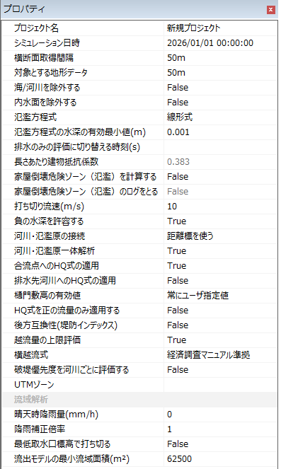 | 16 | 河川・氾濫原一体解析 | 河川と氾濫原の接続して計算を実施するかを設定します。 - [True]: 河川と氾濫原が接続して計算します。(既定値) - [False]: 河川と氾濫原が接続しないで河川のみ計算します。 |